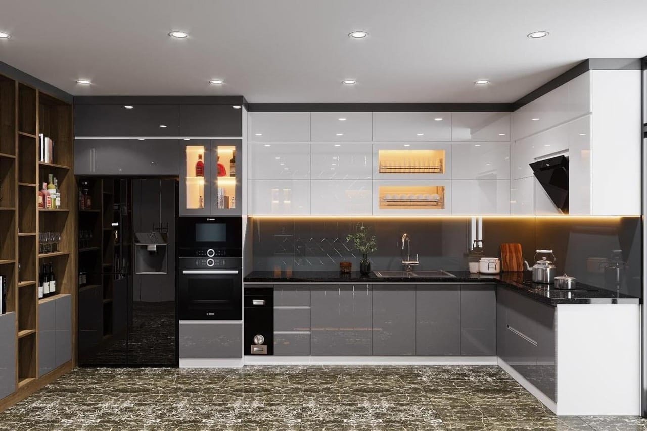 Màu sắc:kết hợp 2 ghi xám tủ dưới và tủ trên trắng mang đến sự hiện đại nhưng không kém phần ấm cúng cho căn bếp.