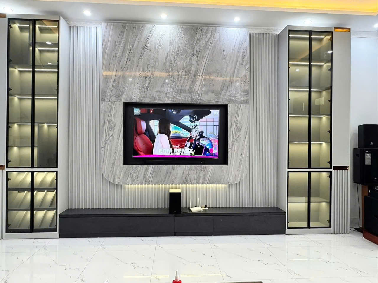 Sự kết hợp này tạo nên điểm nhấn trung tâm ấn tượng, với vách tivi từ vật liệu giả đá và hệ tủ cánh kính trong suốt, giúp trưng bày đồ trang trí một cách nổi bật.