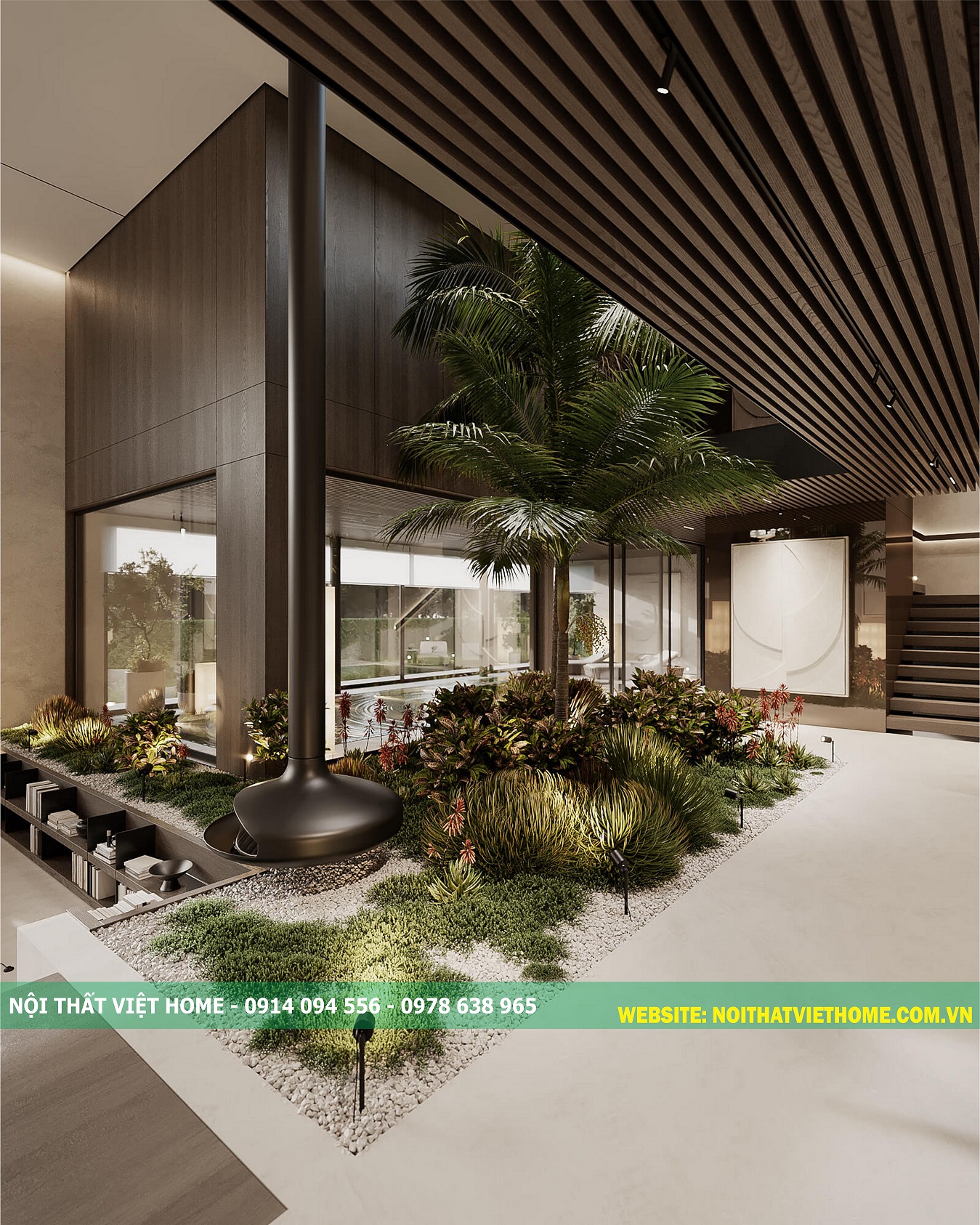 Không gian cây xanh hồ nước luôn là điểm nhấn chính trong thiết kế nội thất biệt thự không gian mở