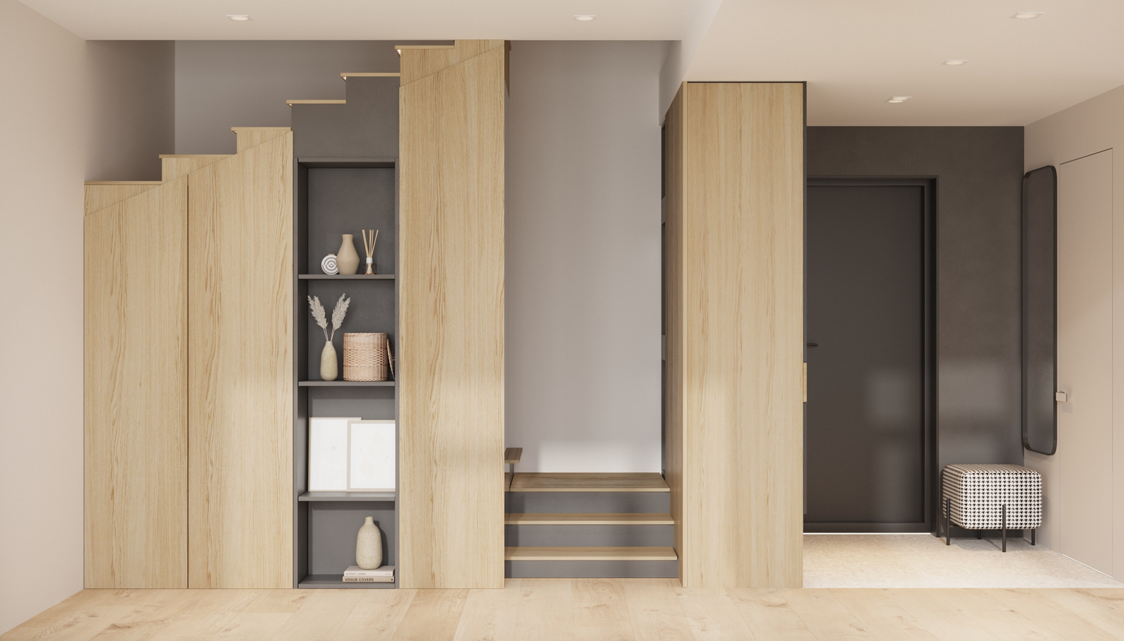 🔹 Tủ lưu trữ thông minh (tích hợp dưới cầu thang, gầm giường)